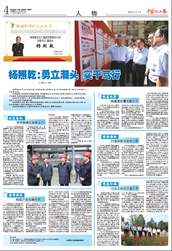 在煤炭轉(zhuǎn)化方面,楊照乾帶領(lǐng)企業(yè)提早建成了蒲潔能化煤制烯烴等大型現(xiàn)代煤化工示范項目,布局了榆林化學(xué)煤炭分質(zhì)清潔利用項目,占據(jù)了錯油煤化、煤基材料的制高點,趟出了陜煤現(xiàn)代煤化工發(fā)展和煤炭綜合轉(zhuǎn)化利用的新路。