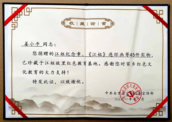 紅巖英烈江姐犧牲72周年紀(jì)念日前夕,姜小平向自貢市江姐故里紅色教育基地?zé)o償捐贈了45件與江姐相關(guān)的文獻史料,讓藏品發(fā)揮應(yīng)有價值,讓紅巖精神代代相傳。