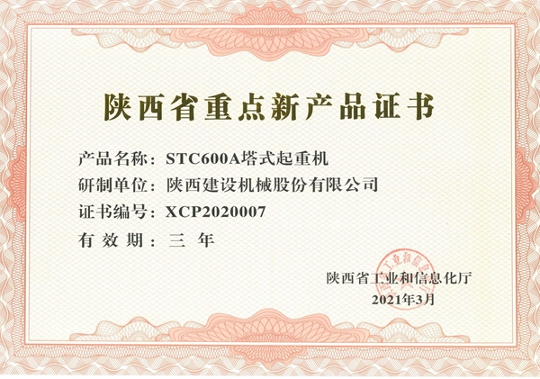 日前,陜西省工信廳下發(fā)通知,揭曉省重點(diǎn)新產(chǎn)品認(rèn)定名單。陜西建設(shè)機(jī)械股份有限公司自主研發(fā)的STC600A塔式起重機(jī)被認(rèn)定為“陜西省重點(diǎn)新產(chǎn)品”。