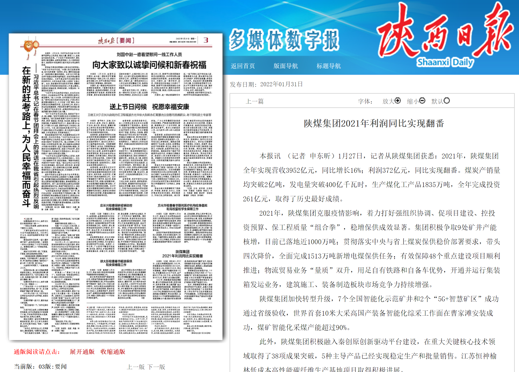 陜西日?qǐng)?bào)  2022年1月31日 3版陜煤集團(tuán)2021年利潤同比實(shí)現(xiàn)翻番本報(bào)訊 (記者 申東昕)1月27日,記者從陜煤集團(tuán)獲悉:2021年,陜煤集團(tuán)全年實(shí)現(xiàn)營收3952億元,同比增長16%;利潤372億元,同比實(shí)現(xiàn)翻番。煤炭產(chǎn)銷量均突破2億噸,發(fā)電量突破400億千瓦時(shí),生產(chǎn)煤化工產(chǎn)品1835萬噸,全年完成投資261億元,取得了歷史最好成績。2021年,陜煤集團(tuán)克服疫情影響,著力打好強(qiáng)組織協(xié)調(diào)、促項(xiàng)目建設(shè)、控投資預(yù)算、保工程質(zhì)量“組合拳”,穩(wěn)增保供成效顯著。集團(tuán)積極爭取9處礦井產(chǎn)能核增,目前已落地近1000萬噸;貫徹落實(shí)中央與省上煤炭保供穩(wěn)價(jià)部署...