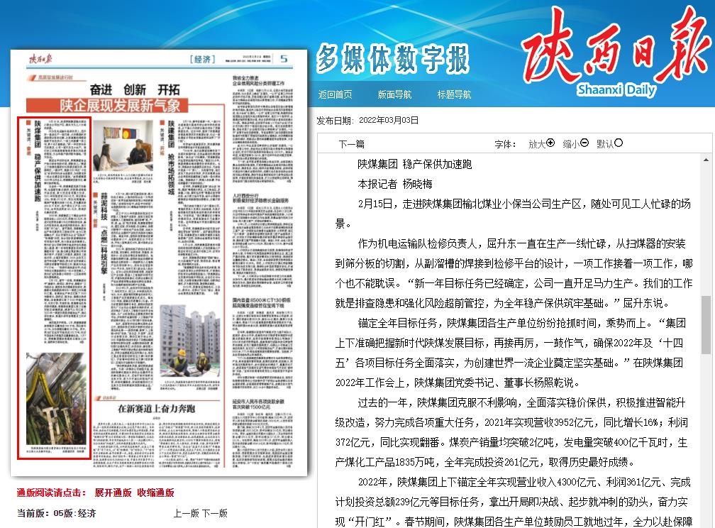 陜西日?qǐng)?bào) | 陜煤集團(tuán)2021年利潤同比實(shí)現(xiàn)翻番