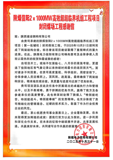 近日,陜西建設(shè)鋼構(gòu)有限公司收到陜煤電力信陽有限公司發(fā)來的感謝信,信中對建設(shè)鋼構(gòu)在承建陜煤信電2×1000MW高效超超臨界機(jī)組項目封閉煤場工程中表現(xiàn)的卓越的執(zhí)行力和管理水平以及不畏艱難、勇于拼搏的優(yōu)良作風(fēng)表示誠摯的感謝!感謝信指出,陜煤信陽2×1000MW高效超超臨界機(jī)組工程項目封閉煤場工程于2025年10月31日順利完成了網(wǎng)架結(jié)構(gòu)合攏,標(biāo)志著該項目建設(shè)取得了里程碑式的重大進(jìn)展。陜煤信電特向建設(shè)鋼構(gòu)全體參建人員致以最熱烈的祝賀和最誠摯的感謝!感謝信中說,自項目開工以來,現(xiàn)場不僅面臨七、八月份的高溫考驗,更遭遇了信陽地區(qū)有...