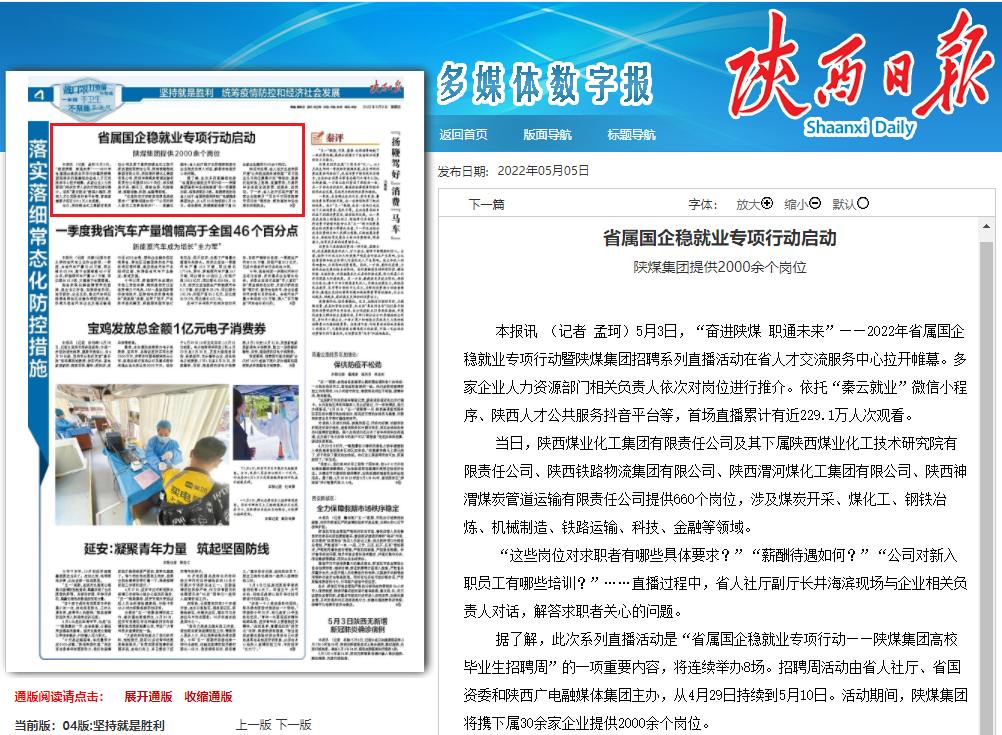陜西日報(bào) | ?省屬國企穩(wěn)就業(yè)專項(xiàng)行動(dòng)啟動(dòng) 陜煤集團(tuán)提供2000余個(gè)崗位