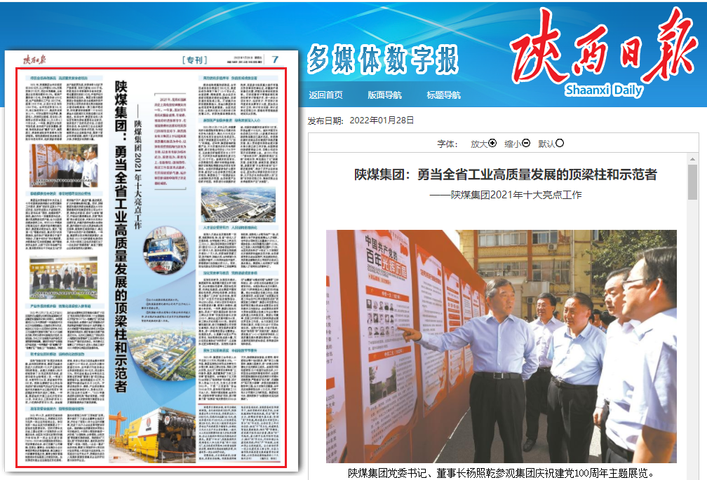 陜西日報2022年1月27日7版陜煤集團(tuán):勇當(dāng)全省工業(yè)高質(zhì)量發(fā)展的頂梁柱和示范者——陜煤集團(tuán)2021年十大亮點工作陜煤集團(tuán)黨委書記、董事長楊照乾參觀集團(tuán)慶祝建黨100周年主題展覽。陜煤集團(tuán)黨委副書記、總經(jīng)理嚴(yán)廣勞深入項目建設(shè)現(xiàn)場調(diào)研指導(dǎo)工作。陜煤集團(tuán)所屬的西安重裝集團(tuán)涇渭新城20MWp分布式光伏項目。全力以赴做好煤炭保供工作。陜煤集團(tuán)渭化彬州公司年產(chǎn)30萬噸乙二醇項目現(xiàn)場全景。陜煤榆北煤業(yè)有限公司聯(lián)合西安科技大學(xué)、西安煤礦機(jī)械有限公司共同開發(fā)研制的煤礦智能快速掘進(jìn)機(jī)器人系統(tǒng)。2021年,是黨和國家歷史上具有里程碑意義的一年...